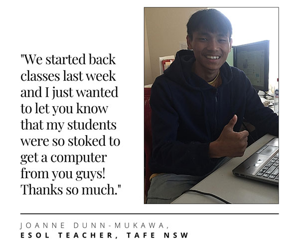 The laptops have been making a big difference for these disadvantaged students who struggle financially. Former refugees are particularly vulnerable at this time as most have no access to computers at home, yet need to study to learn English and to connect with local service providers.
